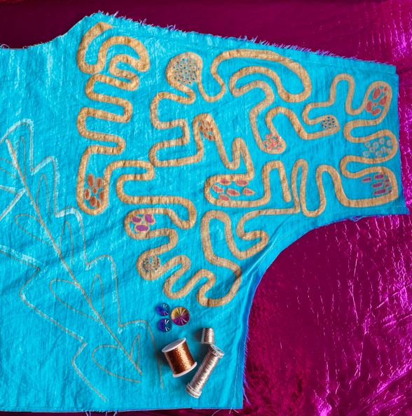 Materials included – jacket, wig, Posca pens, fabric paint, sewn elements such as metallic thread and beading and tassels.